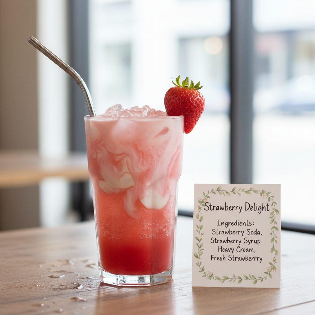 1. 氷を入れたグラスにストロベリーソーダとシロップを注ぎ、よく混ぜます。