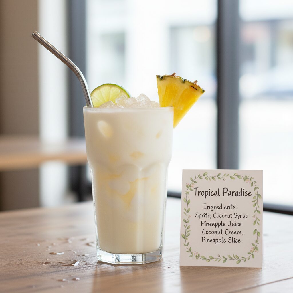 2. ココナッツクリームをゆっくり注ぎ、パイナップルスライスとライムで飾りましょう。
